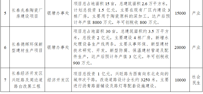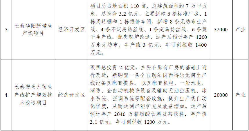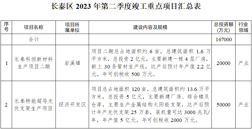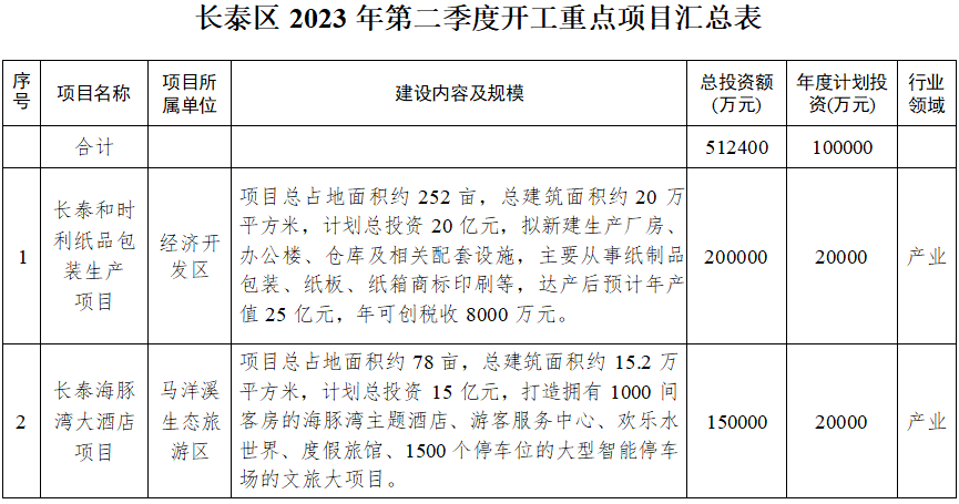 此次集中开竣工的14个项目中,开工项目7个,总投资51.2亿元,年度计划投资10亿元;竣工项目7个,总投资16.7亿元。突出重大项目引领,开竣工投资5亿元以上的项目有4个,其中,和时利纸品包装生产项目总投资20亿元。突出文旅康养产业发展,长泰海豚湾大酒店项目总投资15亿元,计划建设1000间客房的主题酒店。
