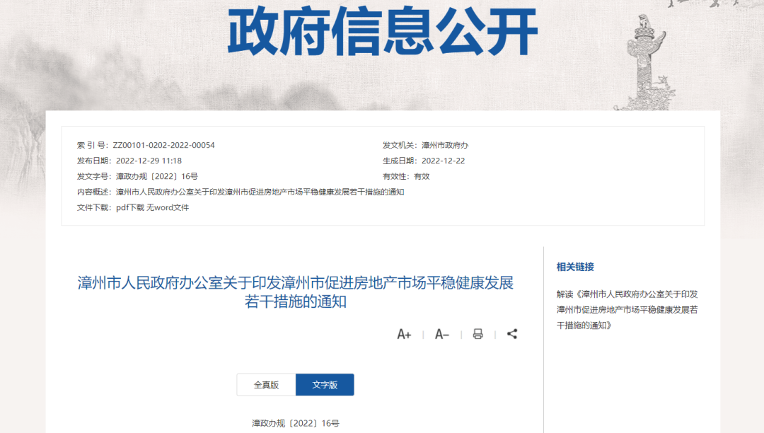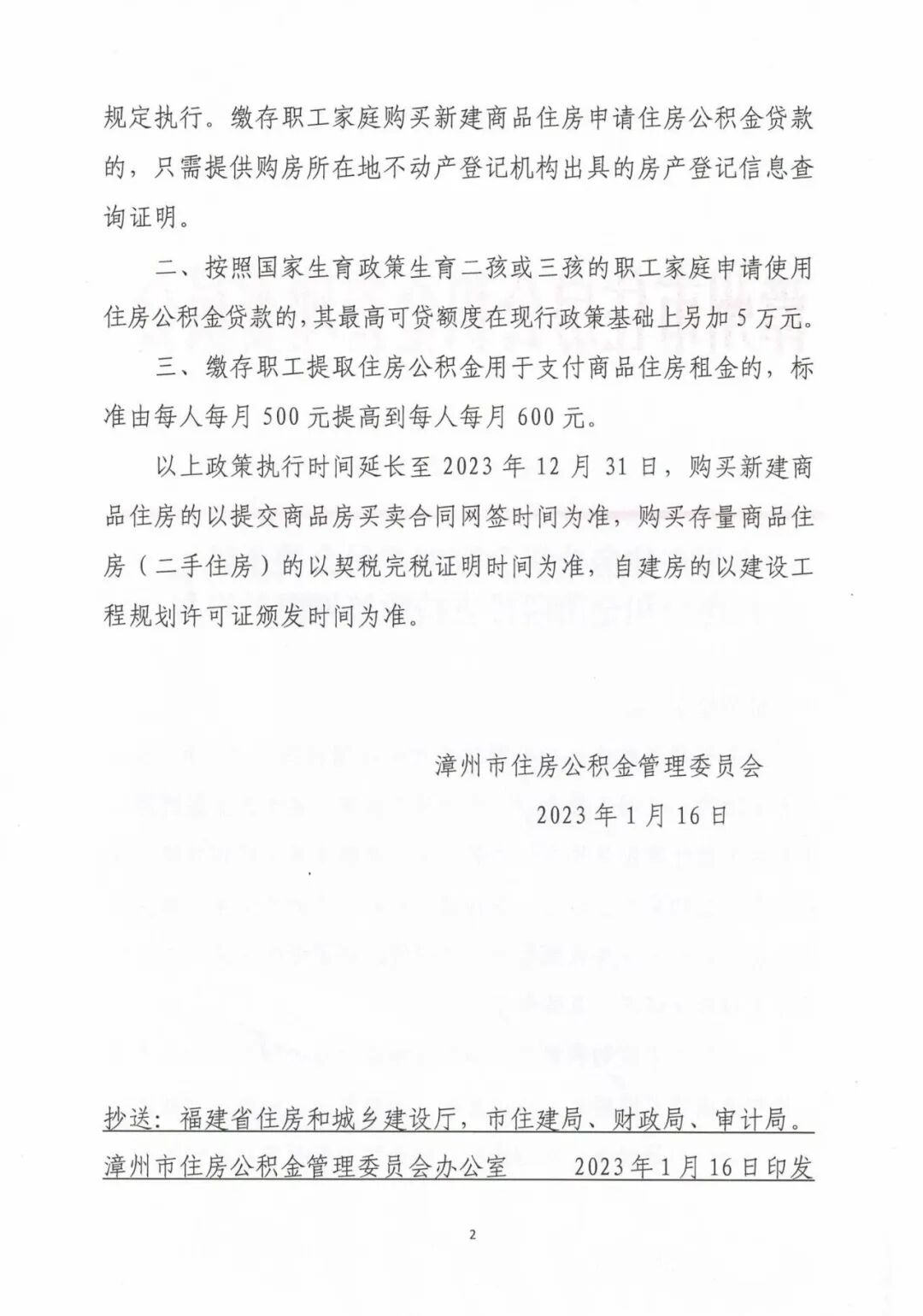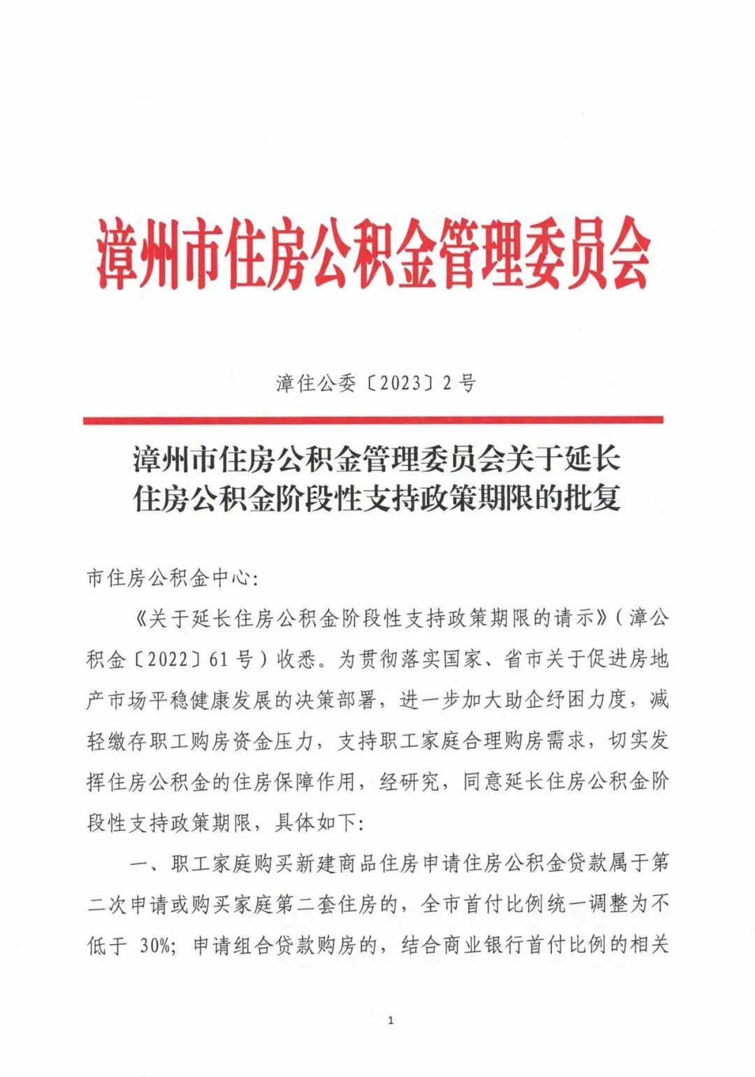 2023年1月16日,漳州市住房公积金管理委员会发布延长住房公积金阶段性支持政策期限的批复!二套公积金首付30%!二三孩家庭可多贷5万!