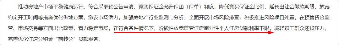 在符合条件情况下,阶段性放宽首套住房商业性个人住房贷款利率下限。减轻职工群众还贷压力,完善优化住房公积金“商转公”贷款服务。