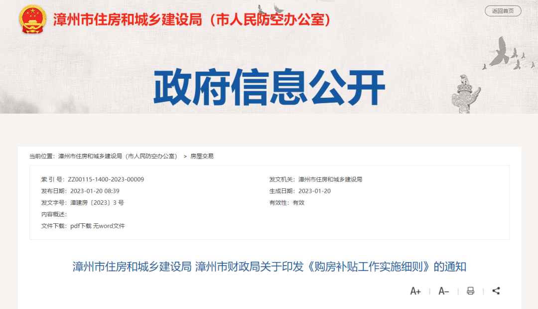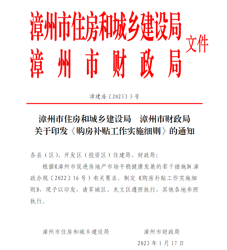 2023年1月17日,漳州市住建局、漳州市财政局联合发布《购房补贴工作实施细则》的通知。